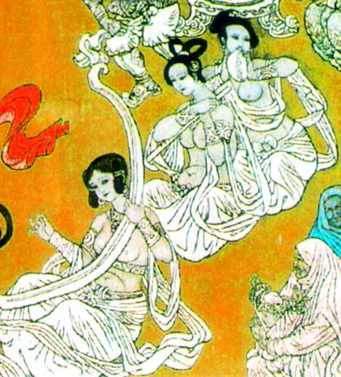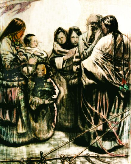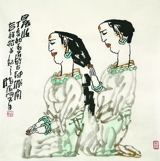 ◎ 赏析8:《雪域》2004,这件作品,画的是青藏高原的宗教生活,是雪域朝圣的人物活动。站立的人物两虚两实,有动有静,远近的几处土坡,其实是五体投地磕长头的朝圣者,近处,历经沧桑的老人弓腰低头,向天真的少女讲述着深奥的道理。人物不管是画形,还是画影,都很传神,但妙处在意境,在对天人关系的哲思。好的写意画“意在画外”,妙在造境。造境展示画家的思想境界,尤其是具有创新意识的思想境界。惟其如此,这件作品的深刻内涵才使人内心难以平静。
