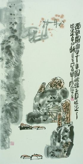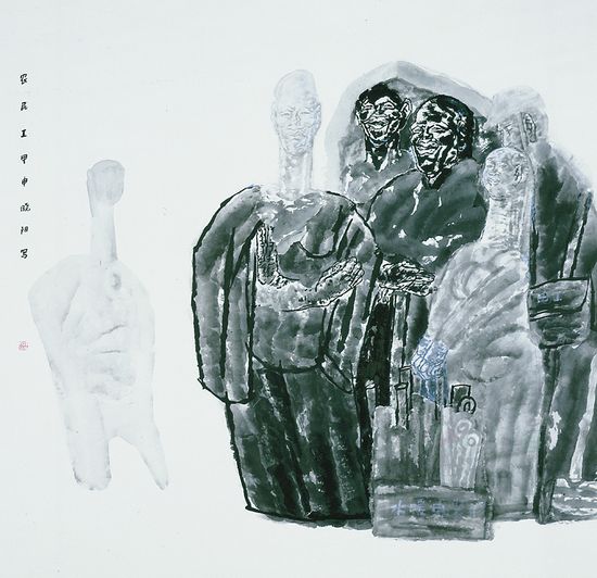◎ 赏析9:《生生不息》2008,《茶有道》2007。前一幅,人画在石头一样的团块里,通过亲情关系和人伦关系的图式,解读了“天行健,君子以自强不息”的民族文化精神。后者,在图像和题跋的结合中,透过“饮者悟透境界不同”,启导观者参悟人生与艺术创作的真谛。两幅作品有一个共同点,那就是以他喜爱的古代民间石刻入画,特别是栓马桩和炕头狮,不仅取其单纯的造型,更取其大朴不琢的气韵。他的这类作品,在意象上,在写实的基础上,经过提炼取舍,走向意造。在笔墨上,把勾勒法、勾皴法、泼墨法、破墨法、积墨法有机地结合起来,追求从容而忘情,明丽而苍茫。在视觉上,新颖而有冲击力。