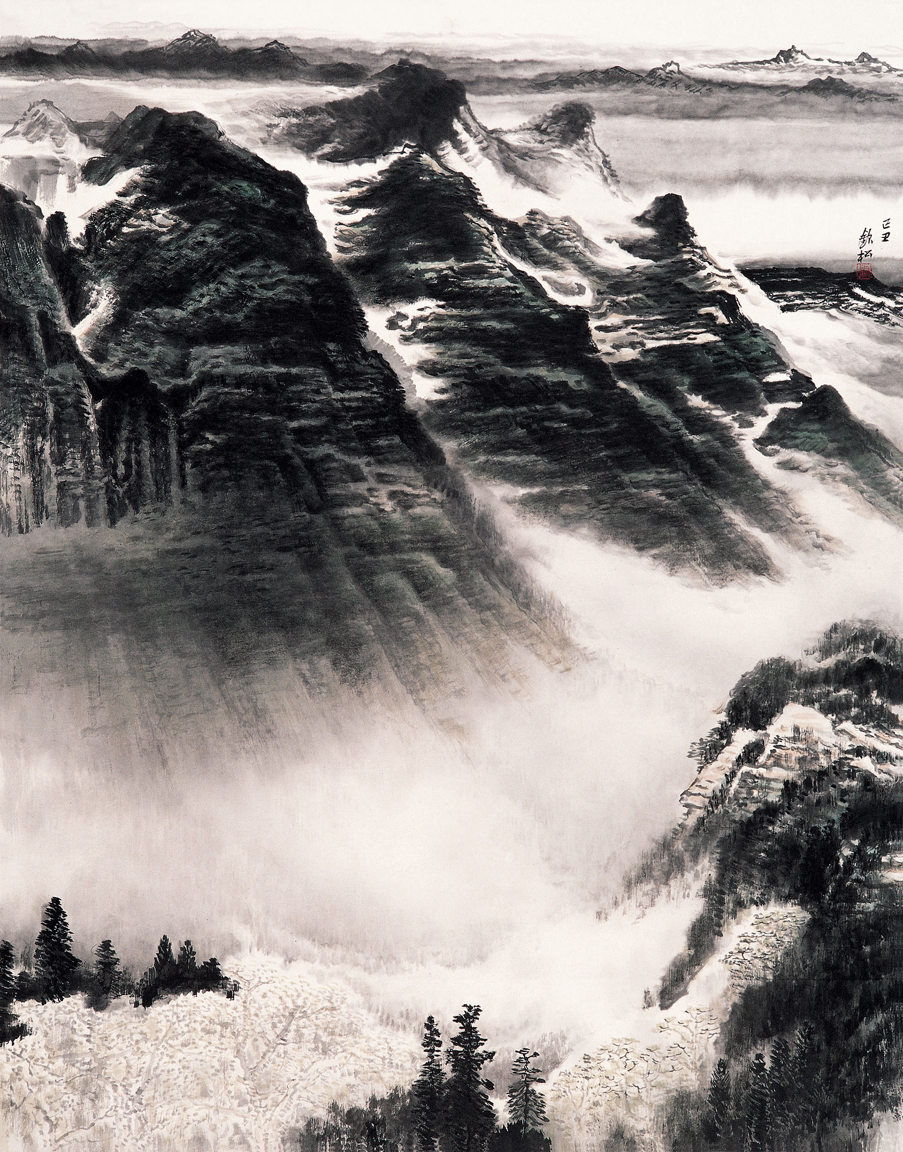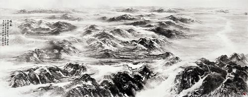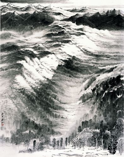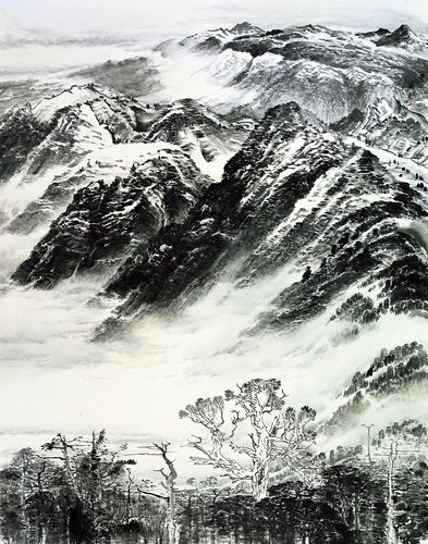 许钦松的作品总是透出一种令人叹服的博大意象,这种博大意象不仅以微观的笔墨取胜,更主要的是靠微观的笔墨和章法组织所构成的“远”的境界。“远”对于作者具有重要意义,既在方法论方面为他的创作实践提供了空间处理的表现方法与透视法则,也在画境的表达方面体现出其独特的体悟自然和表现自然的方式:以“远”达到超出有限之“象”,从而达到儒家哲学的“中和”之美——“大”。故而,他的求“远”不是采用传统的“平远”、“高远”和“深远”,而是以“大”求远:在创作时把视线抬高,犹如自飞机上俯瞰大地,远望取势。这样为之,视线便可以脱离直线限制,不为它物所障,而是流动的、转折的、变幻莫测的。这种由高转深、由深而转向远的视觉方式,既传达视觉所见之真实,又表现心灵之眼所察之真实的空间处理,使观众更加容易朝向视错觉真实的方向来审识作品,空间感觉随着对画面景物“窥”、“望”时的时间流程而呈现出节奏化的诗意。许钦松的作品往往以实求虚、以虚写远,虚实相生而又浑厚滋润,虚处抹一缕烟云般的流动,实处施一种摄人心魄的神秘。如此,“远”由山峦烟云明灭的时空变化的“虚”而扩展,“近”由具体的山峦物象的“实”而显现,远是无限,近是有限,画中由有限到无限,读者的视力和思维则随之飞越,飞向“远”,飞向“无”,飞向“大”,进入“吞吐大荒”的大美境界。