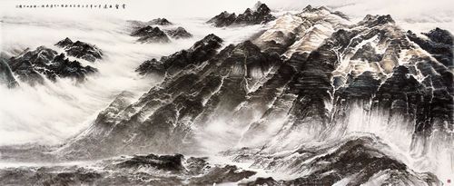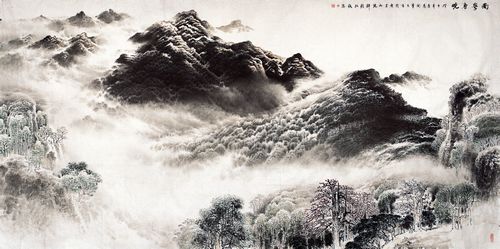 具体言之,许钦松“吞吐大荒”的雄浑之美表现为以下5个特征:首先,它体现为一种整体的美,所构成的意境有如一团自在运行的元气,浑然一体、不可分割,正如严羽所说:“气象混沌,不可句摘。”其次,其间只见自然之象而未露人工拙迹。作品中的山峦、林木、云气全是“依乎天理”而“因其固然”的天然气息。三者,具有一种超乎言象之外的含蓄之美。所绘景色在浑然一体的诗境中给予观众以“近而不浮,远而不尽”的“味外之旨”和“韵外之致”的审美感受。其四,它不仅是形似的美,更是传神的美。因为它浑然一体而不落痕迹,故而具有“不知所以神而自神”的特征。其五,它是一种有生命力的、流动的美,即作品表现出的“雄浑”之美不是平面的、静止的,它具有空间性、立体感,与中国传统文化中强调的“飞动”之美有着不可分割的关系。