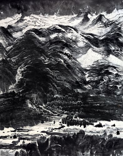许钦松的山水有两大类型,一是以岭南山峦为原型,二是写西北天苍苍、野茫茫的壮美之象。富有意味的是,不论哪种类型,他的作品都绝不是对景写生式的创作,本质上都是以“大笔墨”为叙事表意的手段,在依顺自然之道、按照自然之理的基础上,重新再造了一个具有中国文化精神笼罩的非现实的时空、一个具有大美境界的心灵世界。在这个隶属于“大笔墨”的世界中,原型的自然山形已经升华,转换为审美意象中的“精神图腾”。这个“精神图腾”不再是对客观现实的记录,也不是主客统一前提下表现性的情感抒发,其文化意蕴不局限于儒家、道家、释家而择其一的语境,而是一种超越传统绘画观念的文化整合,这种文化整合是通过“入木三分”的笔墨之美来实现的。