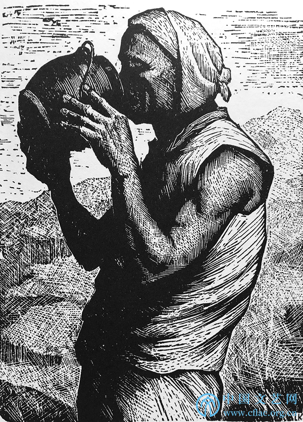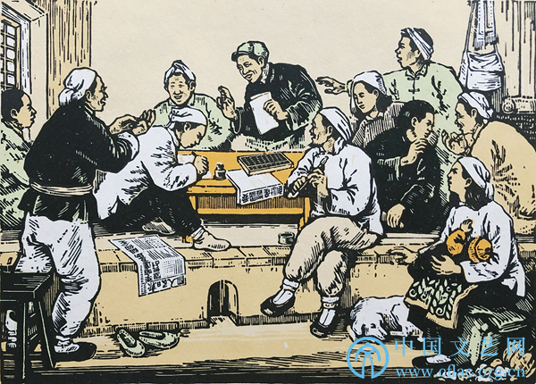 1940年初,力群结束了在国统区的奔波生活,到了延安“鲁艺”。在延安的六年生活,他除了阅读马列主义、毛泽东著作外,还阅读了大量的世界文学名著,他有幸聆听了毛主席在延安文艺座谈会上的讲话,并一起合影留念,成为他难忘的记忆。在延安的窑洞里,力群的人生观、艺术观受到了革命的洗礼,进一步明确了投入革命美术的信念,进一步明确了在艺术上要摆脱外国版画的影响,不能再“戴上脚镣跳舞”。从《饮》《听报告》《送炭》《伐木》等木刻到《帮助群众修理纺车》《〈王贵与李香香〉插图》《选举图》《丰衣足食》,这都是力群在艺术转型期的重要作品,从此也奠定了他属于中国新兴木刻“延安学派”经典作家的地位。