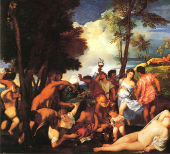 酒神巴库斯,希腊名叫狄俄尼索斯。巴库斯的好友因决斗而死,他含泪将他埋葬,不久在墓上长出葡萄,他将葡萄的汁榨在牛角杯里饮下,顿觉兴奋异常,这就是葡萄酒。后来他把这甘醇的美酒奉献给奥林匹斯诸神,同时希腊人民也得到了他的恩赐。所以在每年秋季葡萄收获时节,希腊人都要举行酒神祭,成为希腊的重要节日。这幅画又名《安德罗斯岛居民欢庆酒神节》。画中所描绘的情节,是在爱琴海基克拉迪斯群岛中的一个叫安德罗斯的小岛上,居民们正在纵情狂欢,饮酒作乐,谈情说爱和跳舞,以庆祝酒神的节日。画家借诸神饮酒的狂欢场面,表达人类的激情。画中人物形象大胆而放荡,色彩丰富多变,气氛热烈,群情激昂。这是对人性的赞扬和对神学的宣战。在画幅压角处,仰卧着一位全身袒裸的美丽女子,这是适应画面的构图需要。这“斜倚的女人体”姿势是继承和发展乔尔乔内的样式,也为后来的历代画家树立了这种姿势的典范。