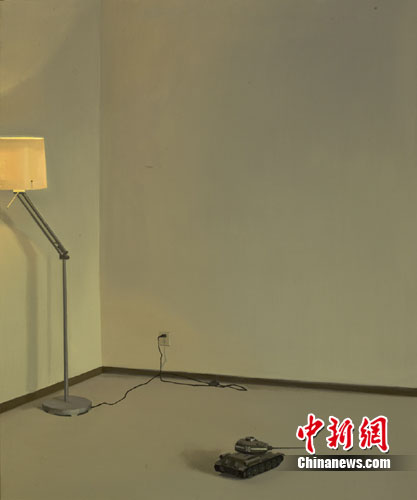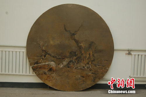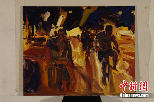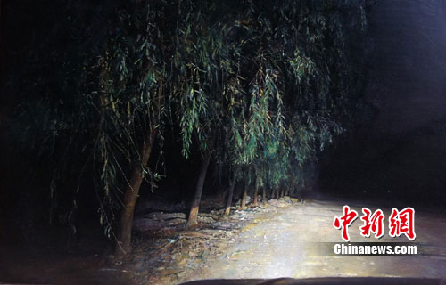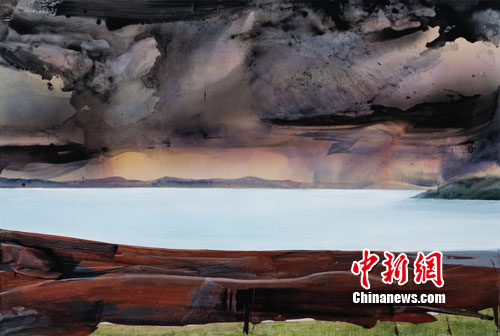 参展艺术家之一、中央美院教师刘商英的作品是西藏组图。“西藏的圣湖,到那里,感觉受到了洗礼,印象非常强,无法抵御的感觉。”刘商英向中新网记者介绍《圣湖》时说:“这幅画,我没有按照照片去画,我没有当成一般意义上的风景绘画去画,主要是画心里的感受。那种感觉是西藏的天空当时乌云翻滚与平静的湖面形成反差,让人好像升腾,不在现实世界的感觉。我希望用绘画语言的不真实感表现当时的真实。”