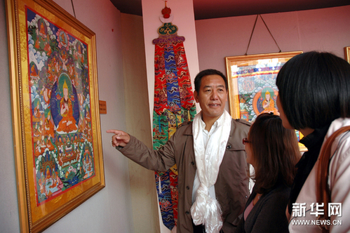 藏族唐卡勉萨派代表性传承人罗布斯达在向参观者讲解自己的作品。