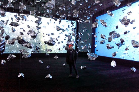 11月26日,雕塑艺术家展望的展览《我的宇宙》在北京798尤伦斯当代艺术中心开幕。展览运用静态装置和视频影像的手法呈现宇宙爆炸的壮观景象。展览至2012年2月25日结束。图为观众在北京798尤伦斯当代艺术中心观看展览《我的宇宙》 。