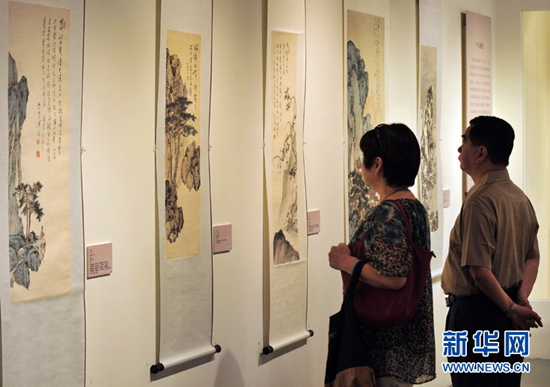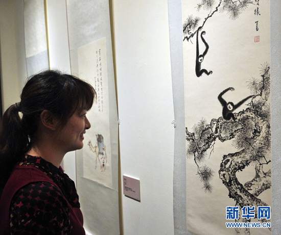 5月10日,观众欣赏溥心畬的《松影双猿》画作