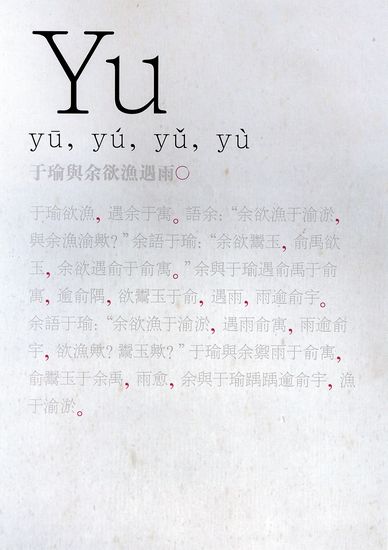 中国语音学上著名的极端范文10篇,只用一个音节的同音字所写成的绝妙文章,在听觉上难以辨析意思的相同声音(当然,有四声变化),明显规避语词文字符号形象的意义所指,分离我们对待语言所习惯的认知态度和固有思维,从而使语言文字符号形式的视觉在场显得十分重要。