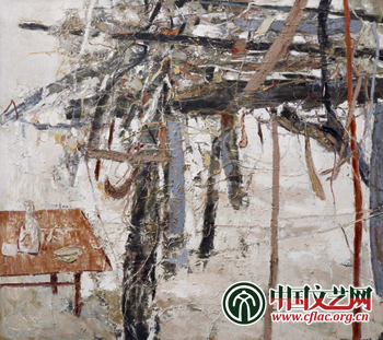 抽象与材料是近年来中国青年油画家着力探索的一个领域,并且取得了很好的进展。段国锋的《物语》、冯相成的《残塘落印》以及内蒙古画家李波、李学峰等人的壁画式表现,通过色彩、材料、肌理的探索,增强了中国油画的视觉厚度和现代感,孙逊的作品《父亲》是一幅特点鲜明的作品,但前景的真实材料与绘画平面的结合稍显突兀。