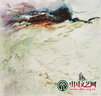 在油画中引入水墨意象与线条之美,是中国油画家对油画这一外来艺术的独特贡献,欧洋的《蹉跎岁月》,徐福厚的《大视野》、翁凯旋的《雪融系列》,金长征的《祈》、李江峰的《化象成境——松之三》、胡大虎的《晓雪》,周建捷的《前村烟树》、宋玉《秋天的胡杨》、张淳大宝的《松与石》等作品,都呈现了画家对中国水墨画的韵味及线条之美的理解和借鉴。他们的作品或研讨线条的敏感,或着力于黑白的韵律,或试验皴擦的肌理,赵培智的《羁旅-马尔杨》、黄于纲的《求全的母亲和孩子》、蓝威的《何处西风》,则运用大写意的豪放笔触,将书法性的用笔引入油画语言的试验空间。