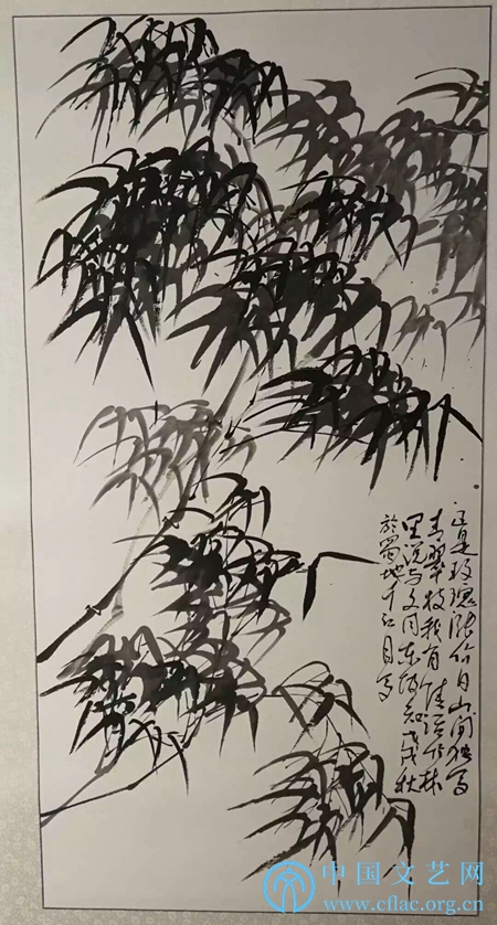 千江月画竹,因与文同之缘分而始,自认宿命、自承使命,凸显了一个真正的当代文化人的文化情怀、文化自觉和文化担当。关键他对画竹有着浓厚的兴趣,兴趣,是一个人的才华所透露出来的隐约消息。“昨夜清风入我怀,吹得墨竹满书斋。”千江月为他的咏竹生活而快意、惬意,为他的写竹光阴而痴迷、沉醉,他不缺天赋、勤奋与激情,不缺方法和思想,且又正值年富力强之际,未来还十分漫长。我始终相信,中国画家的“功夫”是由“工夫”奠定的,时间是不可或缺的要素。首先必须是一个诗人、一个书法家,然后才能成为一个国画家。书法训练为绘画准备笔墨功夫,诗歌(文学)修养为绘画准备表现内容、趣味、风格和意境。正如张汀先生所言:“笔墨是底线、诗意是底蕴。”诚哉斯言!绘画艺术精进的过程,严格说来,就是画家修行的过程,修行是因,艺术是果。假以年岁,我相信,他的墨竹定将名噪天下,为自己觅得一席之地。我们完全可以期待他取得更大的成就!