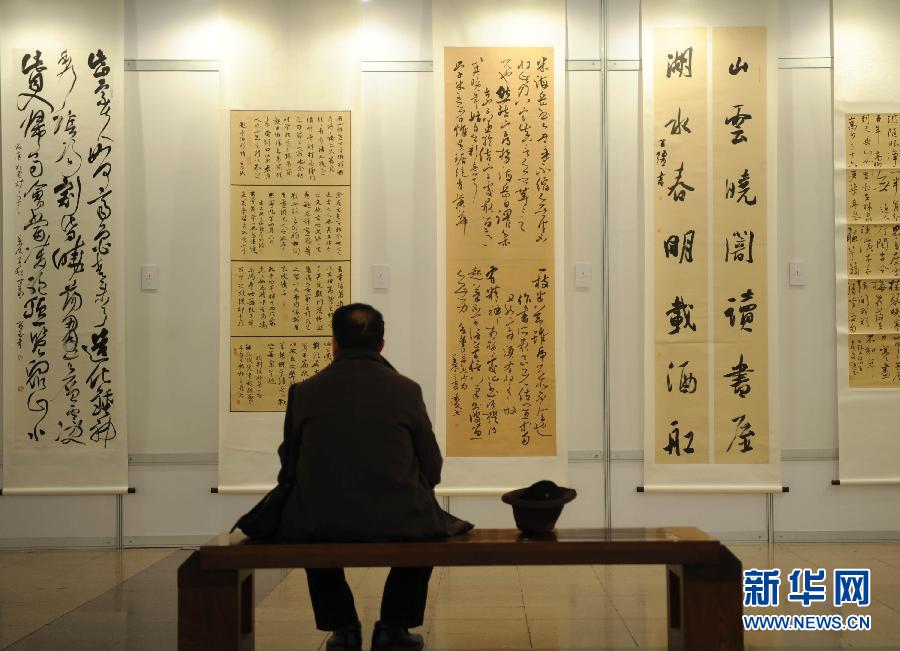 1月20日,观众在河北省博物馆参观行书作品。当日,河北省首届行书大展在河北省博物馆开幕。此次共展出160多件作品,展览将持续至2月26日结束。(新华社发 王晓摄)