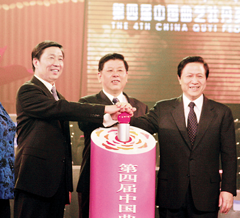 2006年9月23日晚,第四届中国曲艺牡丹奖颁奖晚会在南京隆重举行,图为时任江苏省委书记、省人大常委会主任李源潮,时任中国文联党组书记、副主席胡振民,时任江苏省委副书记、省长梁保华共同启动颁奖盛典 本报驻江苏记者 李晓东 摄
