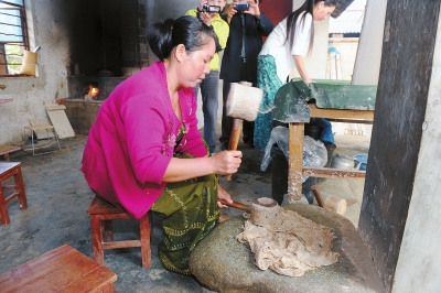 云南省耿马县孟定镇芒团村村民现场展示手工造纸技艺。 肖依群 摄