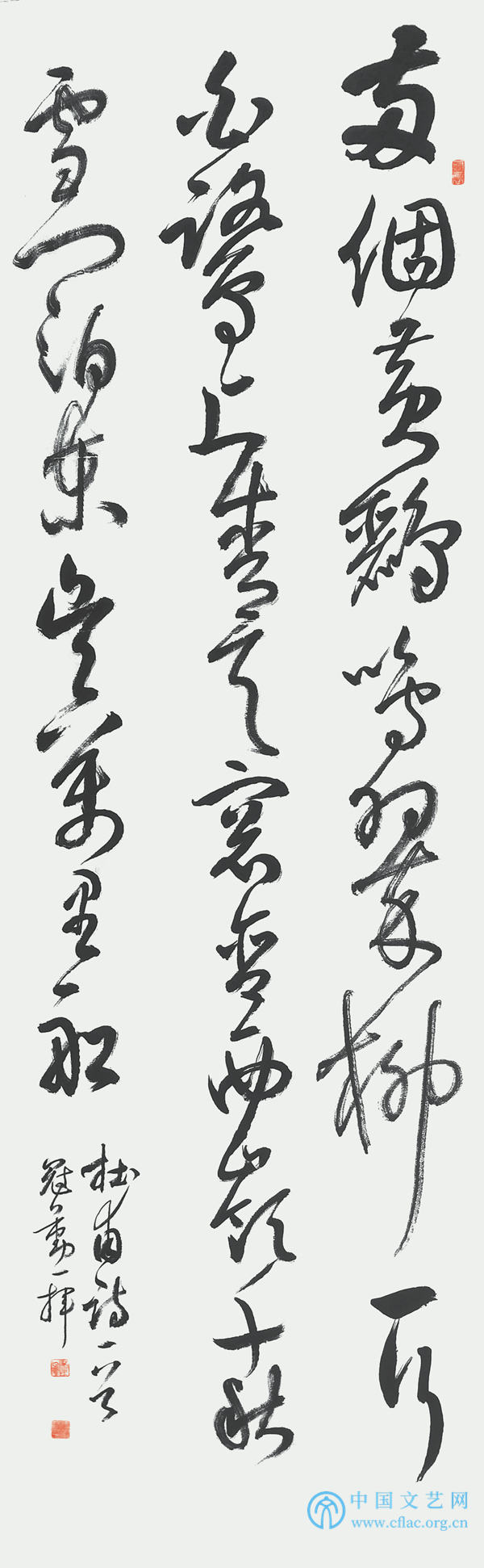 除了研习行书,张冠勤也在草书创作上下了一番功夫。他创作的草书作品杜甫《绝句》“两个黄鹂鸣翠柳,一行白鹭上青天。窗含西岭千秋雪,门泊东吴万里船”,笔势连贯、气势雄浑,既灵动飘逸又古拙憨然。在草书作品张继诗作《枫桥夜泊》“月落乌啼霜满天,江枫渔火对愁眠。姑苏城外寒山寺,夜半钟声到客船”中,刚柔互补,更具苍茫之气。“月落”“江枫”“姑苏”“夜半”浓墨落笔,奔放激越,与其他枯笔形成反差,奇趣乃出。