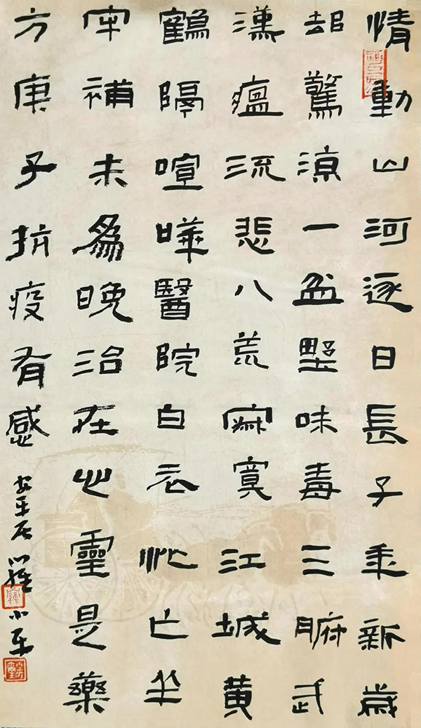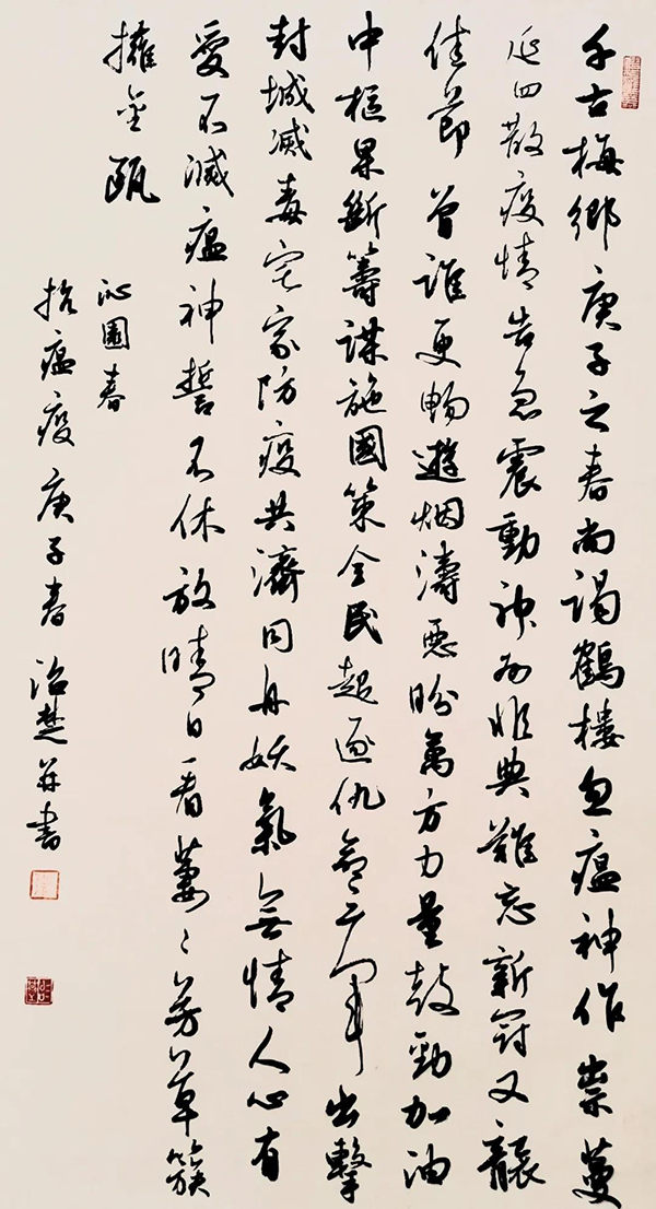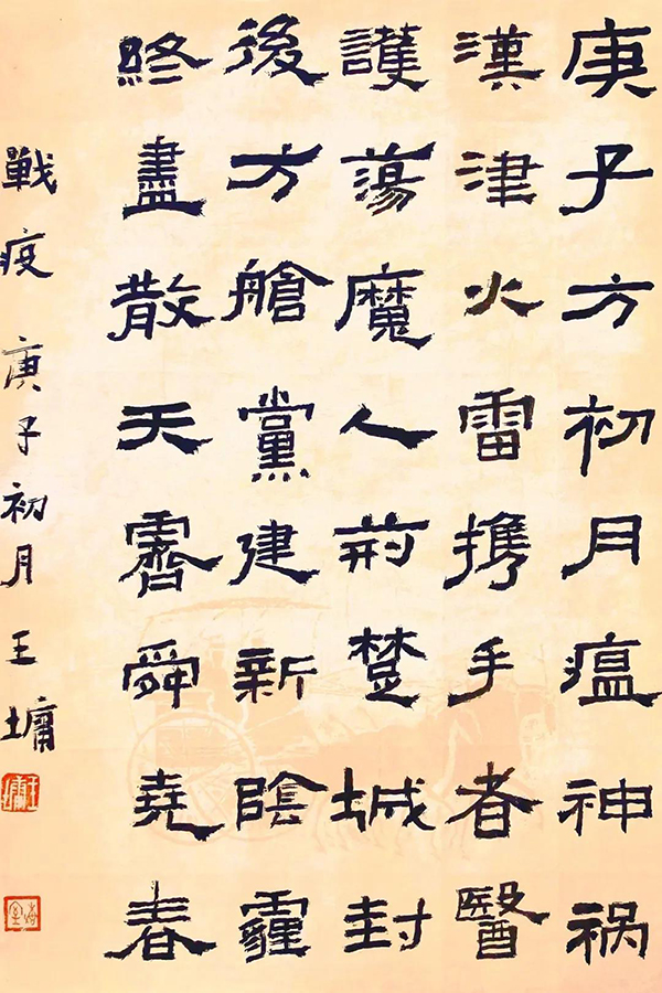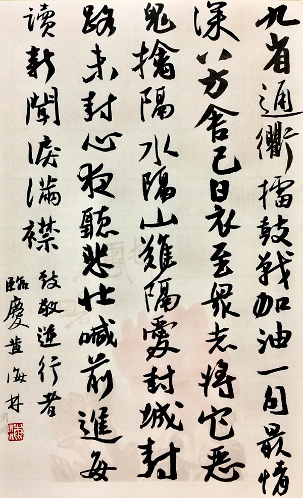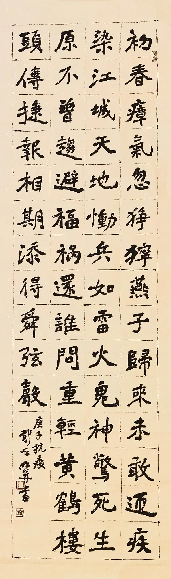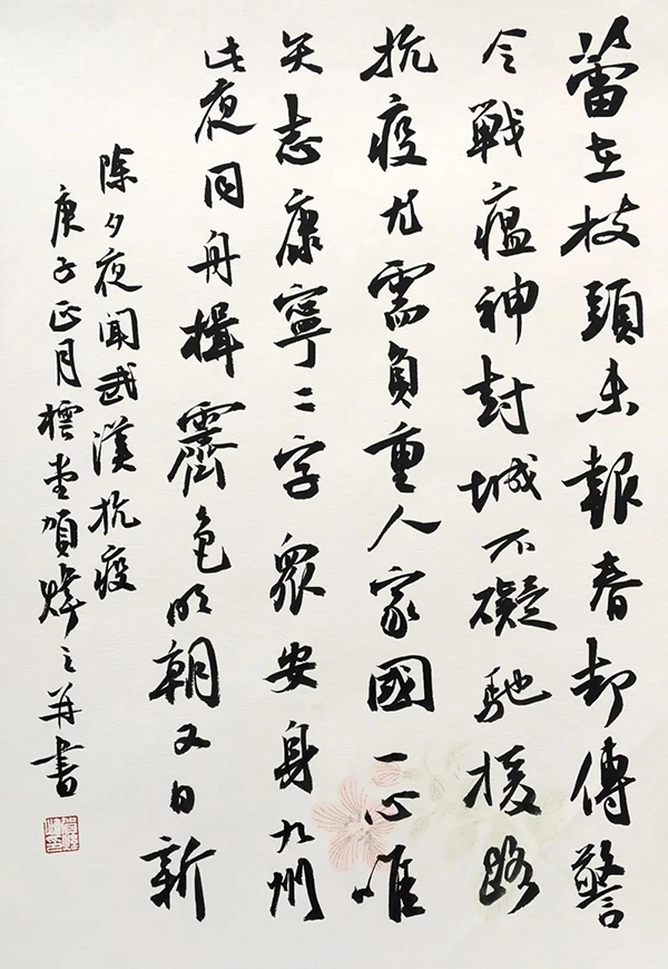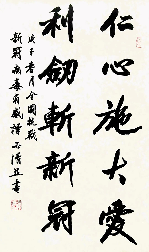 为贯彻落实习近平总书记的重要指示精神,按照中国文联关于要用文艺的方式加强疫情防控的正面宣传、鼓舞群众斗志、凝聚强大正能量的要求,根据中国书法家协会的统一部署,中国书法出版传媒有限责任公司及书法出版社有限公司、《中国书法报》社、《中国书法》杂志社共同组织举办了“防控疫情·万众一心”主题书法网络展,广大书法家、书法爱好者积极响应,创作了一大批主题书法作品。“防控疫情·万众一心”主题书法网络展(第七辑)特邀请部分中国书法家协会“国学修养与书法·全国青年书法创作骨干高研班”成员进行专题创作,通过网络展出,希望通过书法家手中的笔,凝心聚力,鼓舞斗志,为当下这场疫情防疫阻击战贡献一份力量。