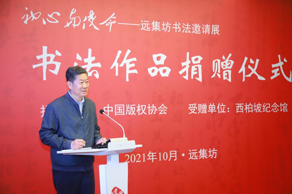 捐赠仪式上,西柏坡纪念馆党委书记金立兴代表西柏坡纪念馆接受捐赠并向中国版权协会及作者代表赠予了收藏证书。他表示,这次收藏的书法作品满载着浓厚的爱国主义情怀,西柏坡纪念馆会妥善收藏,并将这些作品表现出的艺术价值和革命精神,传播和宣传给广大游客。