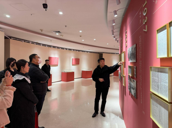 在李宁同志的带领下,学习小组成员认真观看展览,深入了解舒同先生的革命生涯和艺术成就。大家从书法本体剖析舒同书法渊源与艺术特色,也从历史与社会层面理解舒同先生备受推崇的原因。