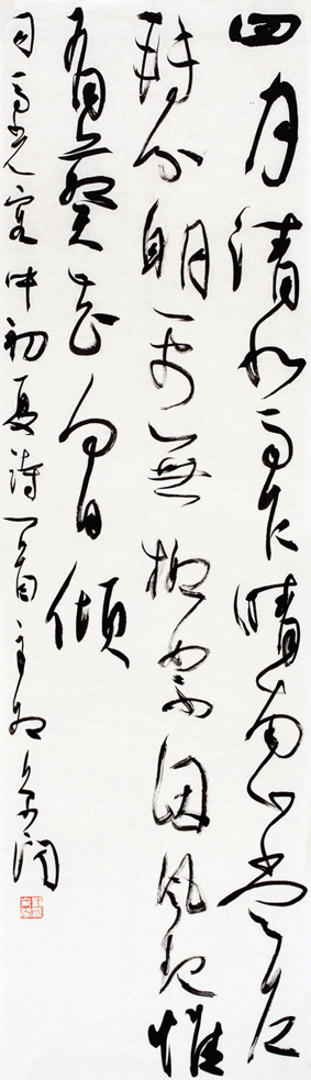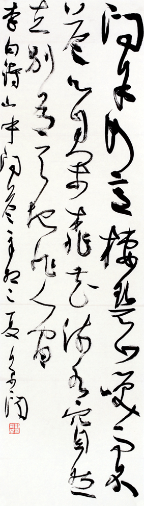 刘京闻在书法艺术方面有较高的造诣,楷、行、草三体皆有不俗水平,其中他的行草书最为突出,尤其是他的行书,笔力雄健,豪气逼人,其行书《古人论书》《月下独钓》《浣溪沙》《饮酒二十首并序》、临颜真卿《争座位》帖、《汉江临眺》等等,皆可见他纵情挥洒,一蹴而就。写行草书难,难在难以驾驭。但刘京闻手到擒来,笔墨开张,运用自如,无论是四尺、六尺、八尺的作品,他都像打乒乓球一招一式的去完成,游刃有余。能够取得如此出众的成绩,首先得益于刘京闻对艺术形式的敏锐感和对技巧规律准确的理解。他认为:“书法艺术不管如何创新,都要以中国汉字为基础,这是根本,也是底线。那些脱离汉字基础的创作,不再是书法创作。”有些人能把字写好,但他们只停留在实用审美阶段,并未进入艺术的殿堂。然而书法脱离实用之后,已经成为一个专门的艺术门类,成为全世界敬仰的艺术奇葩。书法作为一门艺术的存在表现在笔墨层面上,包含笔法、结构、墨法和章法,并寓于大小、长短、快慢、粗细、节奏等丰富的美学变化。当下普罗大众工整、漂亮、有劲的习惯性审美,与书法艺术追求变化、讲究格调的审美要求存在着不小的距离。如果仅仅从实用的眼光出发,而不以艺术性的眼光看待当下的书法艺术,是读不出书法之美的,所以书法并不是简单的雅俗共赏的艺术。书法关乎心灵,是书法创作者情感的表达。在特定的时间和空间的创作,具有不可重复性、不可复制性,它既是时间的艺术,又是空间的艺术。书法绝不等同于写字,她能“达其情性,形其哀乐”,是表达书法创作者个性的符号。所以,要打破长期以来人们对汉字实用审美习惯的观照,让书法家的情感融入线条、章法和墨色中来。书法具有深厚的历史文化底蕴,它不仅仅是技艺的表达和展示,更承载着中国传统文化的信息和命脉。它一方面需要文学、历史、哲学等传统文化的基础,另一方面需要艺术理论、美学思想作为支持,同时借鉴姊妹艺术与外来艺术,它是一种综合学养的表达。要给予书法艺术应有的尊重和敬畏,做书法家是有难度的。