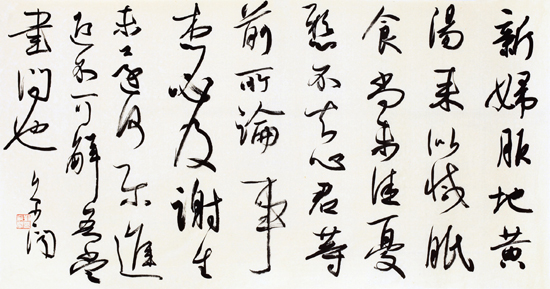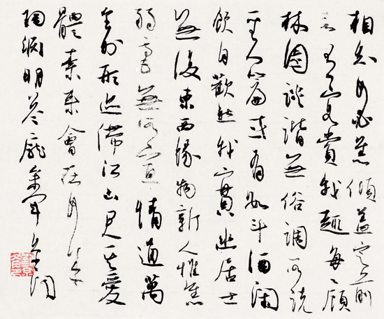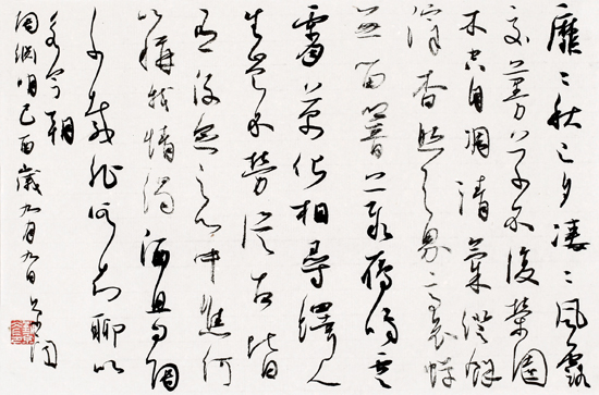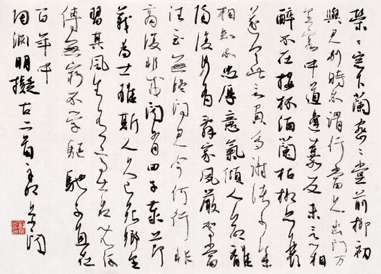 对于书法艺术来说,用笔和结字始终是最基本、最核心的技巧,同时也是个人风格得以确立和展现的基础。其实书法艺术是一门自我情感的表现,并具有生命特征的艺术。应该说,反映书法艺术真正繁荣的现象是一件好事,书法史上的汉末魏晋书法热、唐宋书法热等,正是如此。赵壹在《非草书》中描写广大士人醉心草书:“专用为务,钻坚仰高,忘其疲劳,夕惕不息,仄不暇食。十日一笔,月数丸墨。虽处众座,不遑谈戏展画地,以草刿壁,臂穿皮刮,指爪摧折,见鳃出血,犹不休辍”的热情,真可谓写得淋漓尽致了。当时的草书热,对于推进书法艺术的发展具有不可估量的作用。至于魏晋书法热以及“新体”的出现,更是书法艺术自觉的明证。到唐宋之际,皇帝热衷书学者众,文人士大夫在“尚法”、“尚意”的时代书风影响下,再次把“书法热”推向了历史的高峰。书法艺术从先秦尚象,秦汉尚势,魏晋尚韵,南北尚神,唐代尚法,宋代尚意,元明尚态,清代尚朴一路走来。反思当下,如果我们把所谓的“书法热”,仅仅锁定在数量上,仅以写字的人越来越多,书法展览或是报刊上的书法宣传多多益善为标准的话,那么,如此之热与泡沫经济有何区别,不过流于形式而已。刘京闻清楚认识到这一点,所以他没有随波逐流,他摈除一切杂念,在自身的精神状态和品格追求上下功夫,在用笔和结字技巧等方面讲究到位,他以“二王”为宗,得《集王圣教序》之精髓,又对孙过庭《书谱》用功甚深,还有启功老先生的气韵。他下笔坚劲稳重,提按转折分明,力求涩进疾阻,似欹反正。在点画之间给人丰满圆转,圆中寓方,轻重映带,姿态妩媚雍容之象。线条从容淡定,神气充盈,飘若浮云,矫若惊龙,具有“风神、妍润、枯劲、娴雅”的美感。正如《书谱》云:“一画之间,变起伏于锋杪;一点之内,殊衄挫于毫芒。”刘京闻具有过人的控笔能力,书写时心手相忘,胸有成竹,通篇达到高度的和谐统一。他运笔自如,起笔露锋切入,然后调整笔锋铺毫行笔,疾缓分明,时而行云流水,时而一泻千里;轻如蝉翼,重若崩云。同时,节奏变化恰到好处,气息高古而不失自然。结体亦独具匠心,精致灵巧,疏处则可走马,密处则不透风,意态丰富而情意绵绵。经过数十年艰辛的磨砺耕耘,已成就斐然,他在书法领域的成功体现着当今书坛行草创作的某些观念和信息。从学术的观点上来看,刘京闻的创作道路可能会给书法爱好者们一个有益的启示,特别是在当今书坛创作繁荣,学术研究气氛浓郁,多种流派纷呈,传统观念和求新创变的思想相互借鉴,相互碰撞的状态下,更有一定的意义。