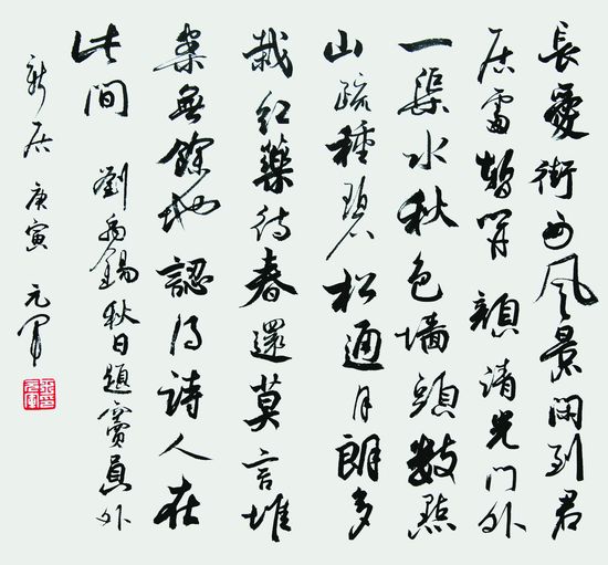 沉静。他临帖极为细致,于节奏、疏密、黑白、姿态特为看重,能做到纤维克肖、形神兼备;作品细腻到位,用笔极为清晰,正如他的为人和研究一样,不掺杂半点含糊,带有一种特有的透亮感和清雅之气。王元军书作胎息于王(羲之)、杨(凝式)、米(芾)、白(蕉),醇和雅正,其静穆之气,诚乃学人当行本色。