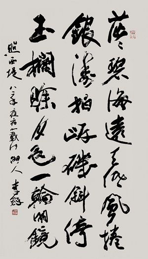 李铎先生的诗词尤如他的书法,大气磅礴,豪情满怀,蕴藉着丰富的革命英雄主义和浪漫主义色彩,读后令人胸襟开阔,视野幽远。“自古七旬少,如今不算稀。书坛耄耋者,健笔走龙霓。文翰丰剀切,闻鞭更奋蹄。扶云攀桂殿,再逼几层梯”。这是一首何等豪迈乐观自励的诗篇,彰显出李铎先生人格的巨大魅力。诗中有书,书中有诗,诗书交融,书诗贯通,其书法的笔墨语言与诗词的意韵风神相拥相抱,体现了一代大家满腹才华,饱学苍穹。李铎先生善于把远大的理想抱负与书法创作的精神相统一,在诗词创作中体现为革命的浪漫主义与现实主义的完美结合,站在当代书坛的最高点上,以书诗之魂连接大地乾坤,扶摇蓝天太空,一派壮美景观,一片令人心往驰骋的凌云境界。