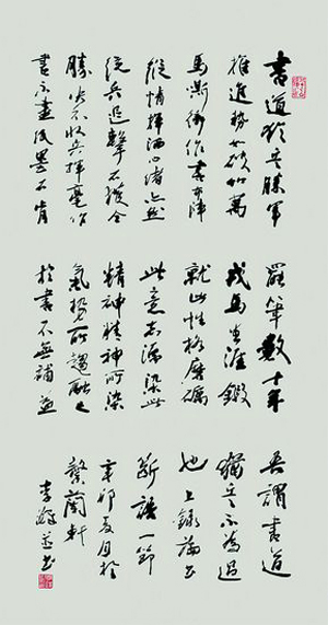 “丛林戈未息,豺虎正嚣尘。瀚海残鲨集,边城乱鬼麋。研我三军略,滔我战时勋。布阵云山合,当关细抚琴。”这首强国强军的有感之作,恢宏豪放,气势逼人,彰显着军旅特色,这与他戎马生涯数十载有关。虽然他没有用主观意识去打造某种书风,然其阅历、心境、胸怀、格调乃至对书法的长期磨砺,折射出了他的军旅气派。李铎先生打造的军旅书风样式,不仅是指书法创作自身的笔墨技巧和章法构图,还涵容了属于军旅大文化背景和大文化范畴的文化属性以及军旅大艺术范畴的艺术素养。他的书法强调个性,强调主观表现,纯然是高屋建瓴,所向无碍,汪洋恣肆,纵横捭阖的气概,着眼整体战略而不拘泥一城一池之得失,势可必然地成为书法历史长河中的壮举与当前时代精神相碰撞的一股潮流。它大大区别于纯文人性质书法风尚和时下任何流派风格趋向,正是李铎先生书法风格特色的高深精妙之处。