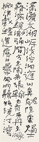 在幺喜龙的草书用笔中多用“圆笔”和“方笔”。幺喜龙在圆笔中表现出了雍容深厚、深沉浑穆的气象,同时线条流美,字势意态多于变化,笔致轻盈流转,表现出一种妍美、秀美、优美,折射出他生命深层的波动,这是由内而外的心绪流淌。幺喜龙在方笔的使用中则是以直线的折角取代了柔和圆的曲线,折射出他刚硬雄强的性格。其实,方笔和圆笔相联系的是转和折,圆笔用折法,方笔用折法,转如流水,折似劈刀,分别代表了阴柔美和阳刚美,也就是西方美学所谓的优美和崇高。欣赏美与崇高的事物之能力,直接取决于欣赏者的认识——任何东西,如果我们在其中看得到符合于我们人生观的生活,那就是美的;任何东西,如果是比我们拿来跟它比较的事物更伟大的,那就是崇高的。所以,美与崇高在现实中的客观存在也要配合人的主观看法。