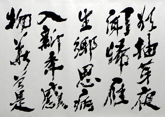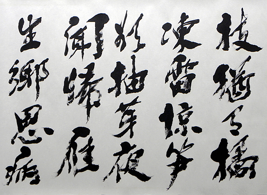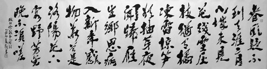 总之,在观赏其书法笔墨时,总会令人体悟到:或雄壮、或悲戚、或静寂、或高傲、或洒脱、或孤傲、或刚强、或柔美、或遒丽、或儒雅、或超逸,或跌宕起伏、或悲怆奋发,或雄武神威、或雍容华贵、或灵姿秀发、或雄姿焕发……等等,使得汉字的独特魅力被淋漓尽致地展现出来,达到了出神入化之境地。其深邃的笔墨线条功力不仅富有哲理性、情感性、艺术性,而且富有深厚的传统性、高尚的时代性和强烈的个性,通过其书法笔墨线条和结体、章法布白之神妙变化的表现,使汉字书法艺术焕发出强大的内在生命力和无尚的艺术美,总令人遐想、陶醉与神往,而感叹不已!