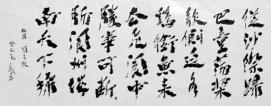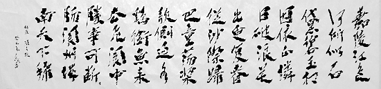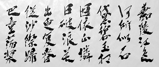 纵观苏东天书《閬水歌》的笔法布置,可以说既有竖势,又有横势,横竖势相连贯;字字相互照应,行行顾盼呼应,阴阳起伏,笔笔不断,气脉相贯;字字有变化,字字有个性,行行有变化,行行有风格,错落有致。金篆、碑隶、正、章、行、草等笔味融化于自我的笔墨之中,二王、颜柳、张旭怀素、东坡山谷等笔意亦自由自然地融化于其笔法之中。其笔法可由变圆为方到变方为圆,由变长为短到由短变长,再有从变断为连到变连为断,由变同为异到变异为同,变直为曲到变顺为逆等等;笔锋或藏或露,或轻或重,有方有圆,有中有侧,乍曲还直,似徐却疾;或柔或刚,或含或露、或收或放,极尽变化之能事。奇中有险,险中出奇,虚实疏密、润枯肥瘦交织在一起,于错落中求变化,与参差中求和谐,变化之丰富莫测,可谓随心所欲而不愈矩,这可谓是构成此篇章法的基本格调。