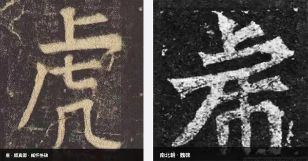 随着唐朝享国日久,谁祧谁不祧的问题就出现了。唐高祖李渊时期供奉的太祖李虎,自然被“祧”了,“虎”字名义上也不再成为名讳。比如,颜真卿的《臧怀恪碑》中就有“虎”字,已与当代写法无二。颜楷以“几”代“巾”,把挂在字中间的“长尾巴”,变成了“几”字的折弯钩,视觉上看起来还是个完整的字形。这种写法在此前隶书和魏碑中偶有出现,但并非主流。