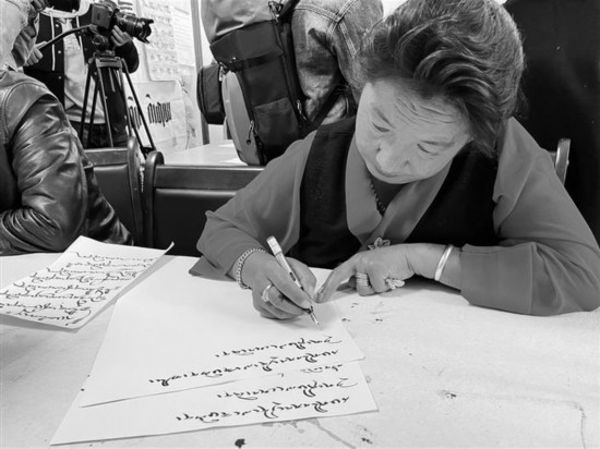 今年50岁的穷达是蔡村四组的村民,她自幼喜爱书法却苦于无人教授。2019年,拉萨市城关区开展“新时代文明实践站·一村一特色文化品牌村(社区)创建活动”,蔡村将“书法”定为本村的文化特色。同年6月,拉萨市文联、拉萨市书法家协会授予蔡村“书法村”荣誉称号。为了进一步普及书法文化,蔡村建立了新时代文明实践站书法活动室,并迎来了第一批书法爱好者,穷达就是其中之一。经过两年多的刻苦钻研,她已经写得一手漂亮的藏文书法。