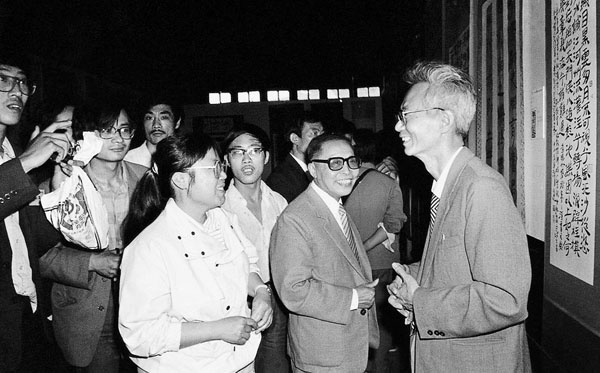 1987年11月25日,32岁的海外女书法爱好者冯梅妹(左一)在一次展览上向中国著名书法家、时任中国书法家协会副主席沈鹏(右一)请教临摹中国历代名家碑帖的技巧。王刚法/摄