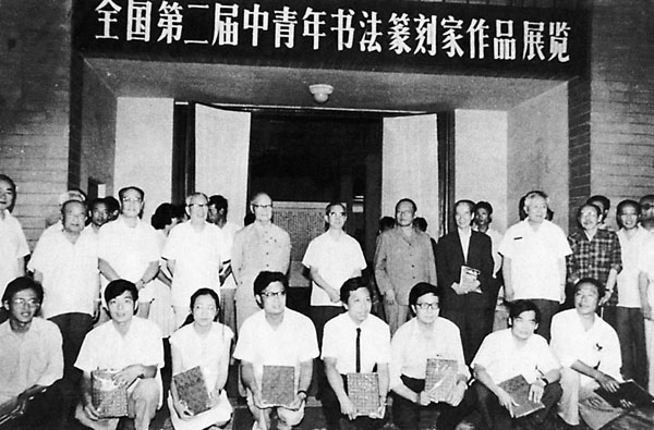 1986年7月16日,党和国家领导人习仲勋(左七)、方毅(左六)、宋任穷(左四)、钱昌照(左五)和全国第二届中青年书法篆刻家作品展览获奖作者合影。张力/摄