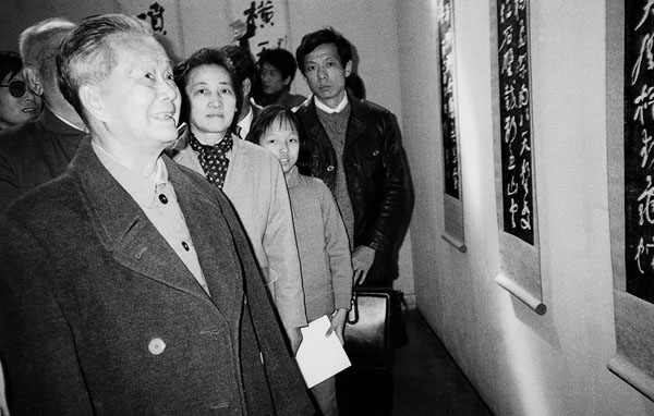 1988年12月2日,舒同首次书法艺术展在上海开幕,图为舒同和夫人王云飞观看展览。王齐/摄