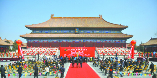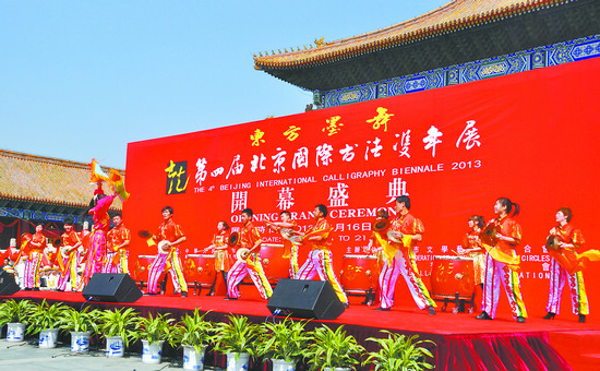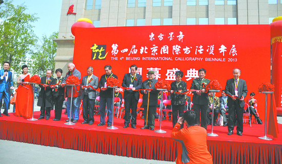 第四届北京国际书法双年展共有八个展览,分布在三个展区,展出1080件书法艺术作品,主展场地在太庙。现在我们举行开幕式的太庙,是一个独具历史文化意义的中国名胜之地。太庙建于明代永乐十八年,即公元1420年。这一年,中国的大明王朝定都北京,也就是说,太庙是千年古都北京近六百年来的历史文化的见证。众所周知,中国书法史上被誉为“古今第一行书”的东晋大书家王羲之的《兰亭序》记载了永和九年(即公元353年)暮春祓禊的一次文人雅集。一千六百六十年后的今天,正值癸巳祓禊后五日,我们又荣幸地在太庙迎来了这么多的朋友,特别有意义的地点和特别有意义的时间,一次盛大的国际书法雅集,至巧纪胜,一定会让我们大家记住今天的聚会。