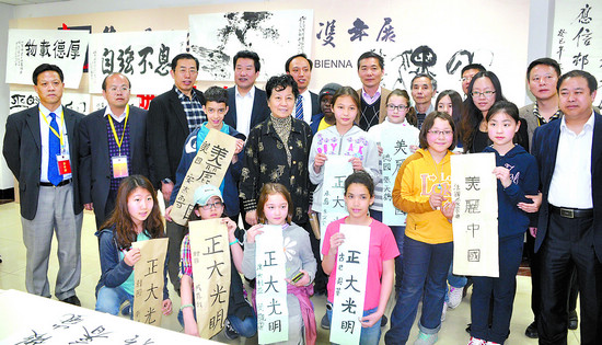 国际学校的小朋友带着各自的书法作品参加研讨笔会
