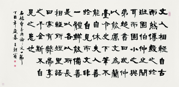 就“勤勉精进”而言,他清远淡泊,超然尘外,归璞返真,最多的一个月,竟然挥去了十刀宣纸。为了减少学习的盲目性,增加学习的有效性,他的治学方法既让人颇耐寻味,甚至感到有趣,即定为楷书年、隶书年、行书年、篆书年的学习规划,并付诸实践。综合系统而有所侧重的探研,数十年来朝宾涉及真、草、隶、篆、行诸体,可以说无所不精,“上承魏晋气韵,下接汉唐风骨,既与古人和而不同,又与时风拉开了距离”。无论是高三米长十余米的恢容巨制,还是方寸之间的盈尺小品,都有古雅蕴藉、朴质苍健,畅酣淋漓的鲜明个性和审美取向。九十七岁的孙其峰老在《王朝宾书法作品选》序中称其已近于大成,诚非过誉也。