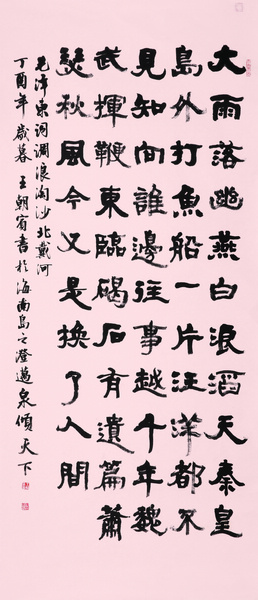 王朝宾生于1945年,室号“寒暑斋”。早在八十年代初期,朝宾即以笔墨淋漓、变化莫测的狂草名震书坛。1984年的首届中原书法大赛对中国书坛影响颇大,令人注目。大赛评比,朝宾的作品一举夺金,捧走了光环昀照,万人仰慕的一等奖,从此,中国书坛上升起了一颗耀眼的新星。之后,他又获得首届龙门奖二等奖,参加了国际书法展、国际临贴展、首届墨海弄潮展、全国二至五届书法展,首届、第二届全国中青年书法家作品展、首届全国楹联书法展、中日书法作品联展等重大国内外书法展,出版有《中国书法通鉴》、《民国书法》、《汉碑全集》、《毛泽东诗词书画精品典藏·欣赏》等专著,又有多部个人书法集行世。