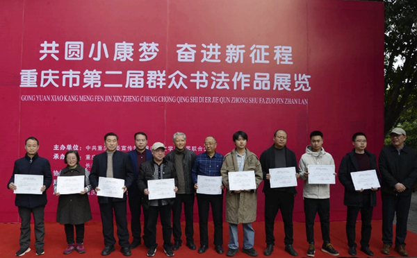3月5日,“共圆小康梦奋进新征程——重庆市第二届群众书法作品展”在重庆市文联美术馆开幕。图为领导和嘉宾为获奖作者颁发获奖证书。