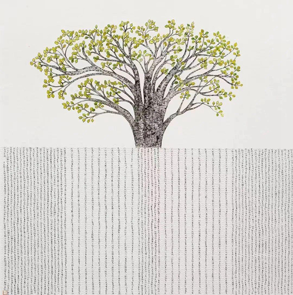 郑勤砚作品中的清新雅致离不开她骨子里的古韵。她继承了传统文脉中“书画同源”的表现方式,将书法与绘画并置,更显相得益彰。展览主题“水云间”恰如其分地诠释了郑勤砚的作品——既有着一份古意禅宗的宁静致远,又在这份淡雅中包罗万象,朴素而优雅,简洁而存真,在细微之间直抵心田,浸润肺腑。