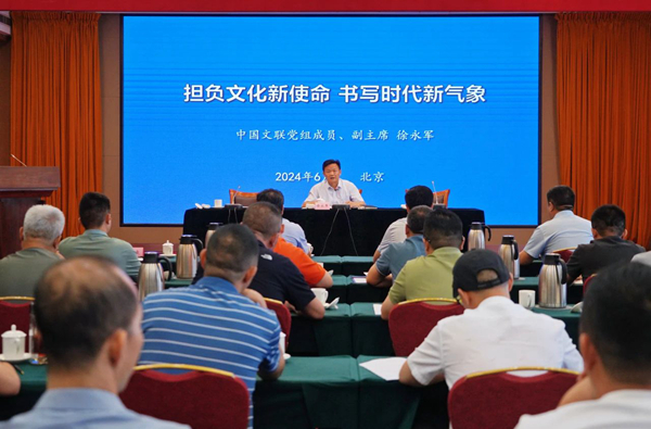 6月17日,“传统文化修养与当代书法创作·第十一期全国青年书法创作骨干高研班”在京开班。中国文联党组成员、副主席徐永军作首场专题报告。中国文联党组成员,中国书协分党组书记、驻会副主席李昕主持开班式,中国文联书法艺术中心主任王彦、协会相关处室人员以及55名本期高研班学员参加开班式。