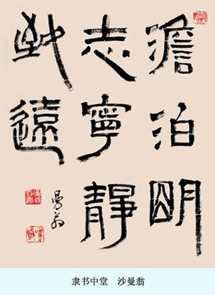 事实上,在他的笔墨世界里,篆隶书如水乳交融一般,难以区分。经过长期的实践探索和理性思考,沙曼翁在古稀之年实现了篆隶通变。几十年来,他神游于三代两汉,终日与钟鼎、简帛、诏版、权量、碑碣、砖瓦、写经为友,把篆书的笔法结体、草书的笔情墨趣有机地融入隶书,又把简帛书的自然天真之趣与碑刻隶书的浑厚古朴之气相调和。更在线质上进行大胆尝试,敢于运用古人慎用的枯涩之笔,使线条润中带燥,力追毛润涩畅、苍浑劲健之感,用他那“沙沙”的笔致表现极富感染力的线美。这种本来只在草书中方能见到的艺术语言使沙曼翁的艺术个性得到充分的张扬。现在,当我们回眸过去100年的隶书发展历程,如果说,俞樾、吴昌硕、沈曾植等为第一代代表性书家,黄葆戉、胡小石、来楚生、吴子复等为第二代代表性书家,那么,沙曼翁则与陆维钊、萧娴、赵冷月、钱君匋、吴进贤、宋季丁、孙其峰、沈定庵等无可争议地成为了第三代书家的领军人物。