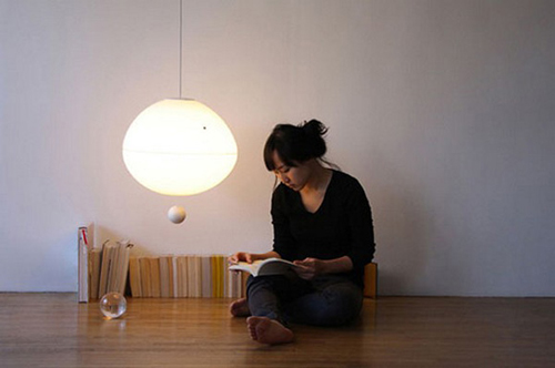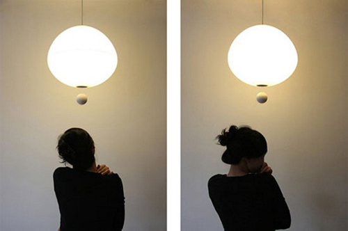 这款名为Fiat Lux的灯从形状上面来看非常的普通,样子也不太起眼,与我们平常看到的吊灯没什么两样,但它提供了一个趣味魔术性的开关。奥秘就在你看到的旁边的小球上面,这个小球其实是这款灯的开关,小球是浮着在灯的表面可以随意的移动。