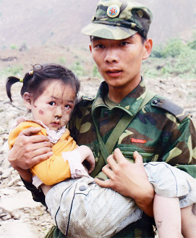 2008年5月13日,3岁的郎铮被解放军从北川县曲山镇幼儿园废墟中救出,获救后他向解放军叔叔敬礼,感动了整个中国,被称为“敬礼娃娃”。杨卫华/摄