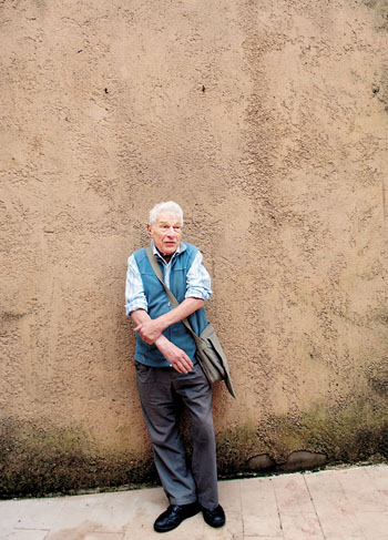 比起在山里的农夫,他只是在肩上多了一个帆布书包。这就是艺术评论家、作家、画家、英国人约翰·伯格的样子。他穿着浅蓝色衬衫,外套一件抓绒背心,大早上就卷起了袖子。我选择以摄影学院的黄色石墙为背景,约翰·伯格像个调皮的顽童对着镜头动了起来,一会儿扬起手,摸摸脸,或大笑着手抄口袋,最后他竟提着裤子向我的镜头冲来。