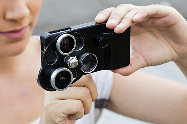iPhone镜头转轮是一款带有3支镜头的光学系统。这3支镜头装在一个手机外壳上,旋转转轮,即可给iPhone换用不同的效果的镜头,包括:广角、长焦和鱼眼。