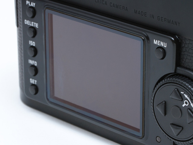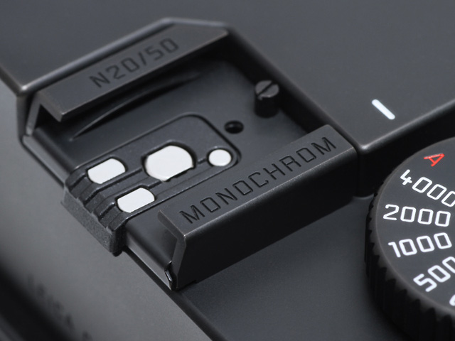 另外一个显著的外观变化是M-Monochrom取消了M9机身正面的红色“Leica”标志。如果仔细观察机身背面还可以在屏幕上方看到“LEICA CAMERA MADE IN GERMANY”字样,背部按键的文字使用白色喷涂颜料。同时,在机顶热靴部位还可以看到“MONOCHROM”的钢印。