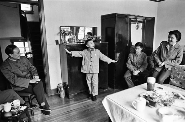 上海 Shanghai 上海京剧团的一名成员在家中指导孩子清唱。
