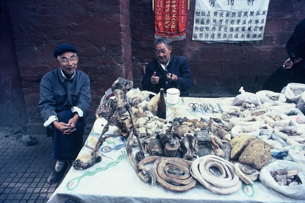 成都 Chengdu 路边小贩,摊位上摆着各种动物毛皮、骨头等部位,桌上也放着加工的器具。